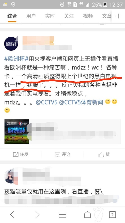 再来看看今年CCTV世界杯直播,在手机端可观看直播的其他软件:央视影音和CCTV微视,其中CCTV微视更偏向于体育赛事的直播,相当于手机上的CCTV5体育频道。但是体验都不尽如人意,直播间送礼物导致直播卡顿,界面设计不合理,更受不了的是,直播还一直延迟,网上都知道结果了,电视这边连球都没进呢,然后到关键赛点时还给你来个缓冲,结果就是球迷都疯了…