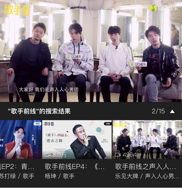看歌手背后故事:QQ音乐还为乐迷们打造了一档艺人深度专访视频栏目《歌手前线》,让粉丝深入了解歌手背后的故事,了解歌手的日常生活。声入人心男团、吴青峰、Kristian Kostov、杨坤都曾在这里揭秘自我,与粉丝、乐迷分享《歌手》台前幕后的故事。
