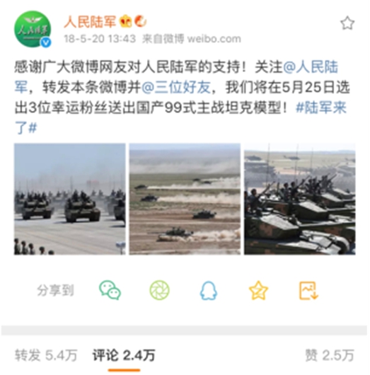 因为火箭军的“战友”——中国人民解放军陆军的官方微博账号“@人民陆军”在上线之初,为感谢微博网友的支持,为3位粉丝送上了国产99式主战坦克模型。从此掀起了军事抽奖热,网友全部被这些硬核奖品圈粉。