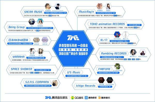 TME致力于能为更多的中国日音迷带去更多优质的日音内容,先后与大型偶像团体AKB48背后运营公司AKS、为知名动漫《银魂》、《夏目友人帐》、《鬼灭之刃》制作过主题曲,专注于动漫音乐的音乐厂牌SACRA MUSIC、日本最大的独立音乐厂牌SPACE SHOWER以及U'S MUSIC这样制作出过大批高品质纯音乐的环境音乐厂牌达成版权内容合作。从流行、ACG、摇滚到嘻哈,甚至是环境音乐。在版权内容方面,TME已经与日本音乐市场建立起了全覆盖、多方位的战略合作关系,成为拥有最多日音版权,最多日本音乐厂牌合作的中国音乐平台,更是成为中国日音爱好者首选的聚集地。